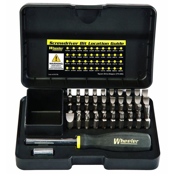 The Wheeler Engineering 43-Piece Professional Gunsmithing Screwdriver Set features the most popular bits for gunsmithing. As any gunsmith will tell you, screwdrivers are the most important and most used tool on their bench. These bits are made from S2 tool steel and hardened to 56-58 Rockwell "C". Also featured on these bits is the Hollow-Ground design which has a gentle curve as it reaches the tip of the bit instead of being straight throughout the length of the tip. This will protect the fit and finish of the screw and spread force equally along the sides of the screw slot so the head of the screw and the tip are not damage. The kit comes with a screwdriver with a non-slip, overmolded handle and a storage case to keep everything in one-easy to find spot on your bench.