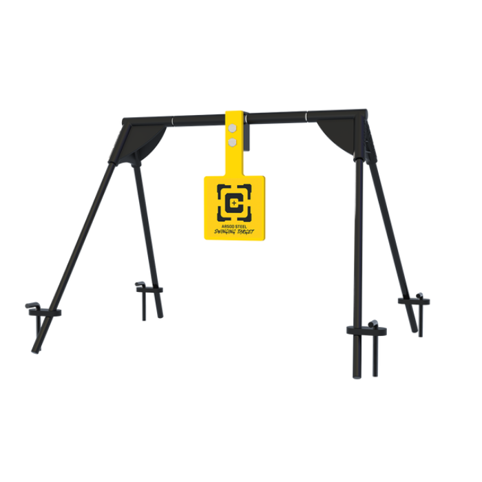 The Caldwell AR500 Swinging Target is constructed using 3/8" rifle rated AR500 steel. The extremely durable cast urethane frame connectors provide a rigid frame yet allows bullets to pass through without damage. The solid steel legs and crossbar provide a rigid frame that can be replaced by 1/2"" rebar if damaged. The target frame is 18"" off the ground and 10"" to the center of the target. The AR500 Swinging Target is highly portable for ease of use. 4 ground stakes are included to secure the target for large rifle impacts. Perfect for centerfire rifles and handguns, these targets are rated up to 3,000 fps impact velocity and 3,500 ft-lb impact energy.The Caldwell AR500 Swinging Target is constructed using 3/8" rifle rated AR500 steel. The extremely durable cast urethane frame connectors provide a rigid frame yet allows bullets to pass through without damage. The solid steel legs and crossbar provide a rigid frame that can be replaced by 1/2"" rebar if damaged. The target frame is 18"" off the ground and 10"" to the center of the target. The AR500 Swinging Target is highly portable for ease of use. 4 ground stakes are included to secure the target for large rifle impacts. Perfect for centerfire rifles and handguns, these targets are rated up to 3,000 fps impact velocity and 3,500 ft-lb impact energy.