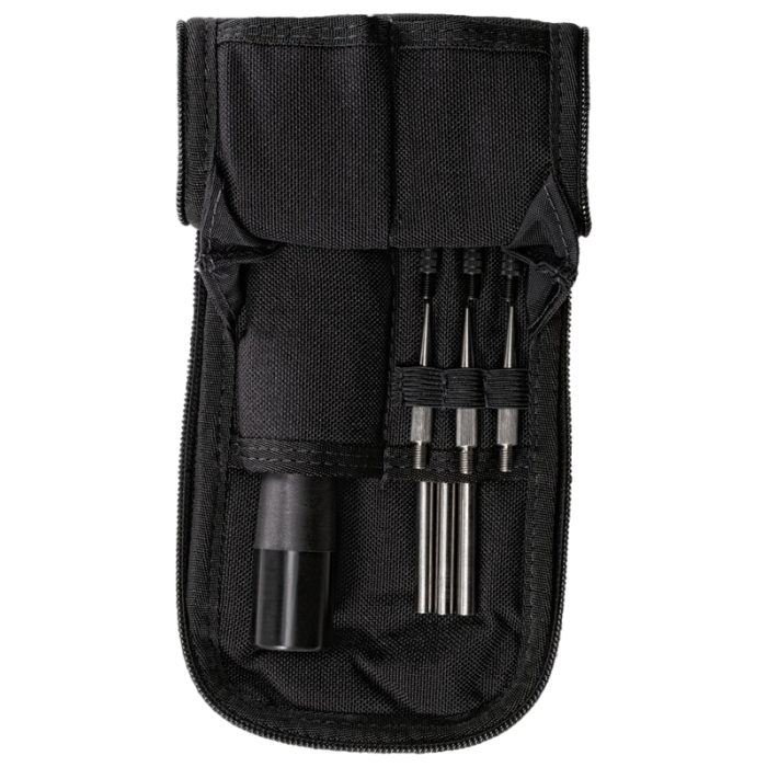 Probe shallow. Probe deep. Probe as circumstances dictate with either Basic Mine Probe Kit or the Deluxe version. The shafts are engineered from titanium, combine for an overall length of 25 inches and are sensitive enough to transmit even the lightest contact. The interchangeable probing tips are made of Delrin, a non-conductive material. The Deluxe version includes the D.E.T. Mutli-Plier and Infinity Ultra Task Light. Both kits come complete with a black ballistic MOLLE compatible nylon sheath.