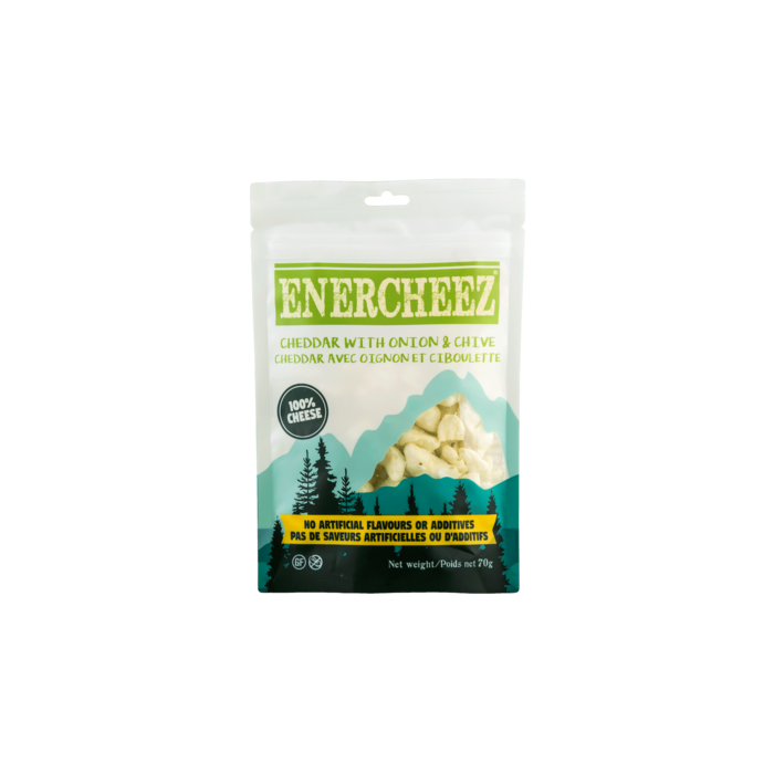 Premium crunchy Enercheez® cheddar cheese snack infused with a hint of onion and chive. Can you say sour cream and onion! Oh yeah. This is the NEW way to eat cheese that requires zero refrigeration! Enercheez® is delicately made from cheese from a small family-owned cheese company nestled in the British Columbian mountains.