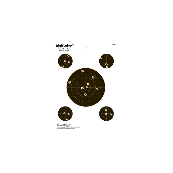 VisiColor high-visibility targets offer shooters an interactive, fun way to sight in and practice. Based on Champion s proven VisiShot® technology, VisiColor provides multi-colored impact halos for easy identification of specific hit locations. The 5 Double-Bullseye and a Sight-In option give shooters even more down-range variety. 10 Pack