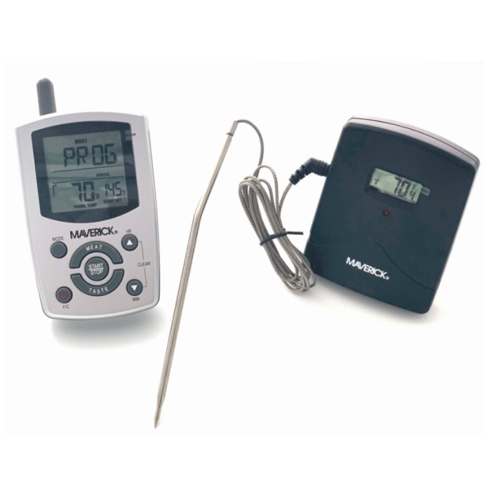 - Wireless Transmitter with 300 Foot Range: This thermometer with remote features a transmitter that reads the internal food temperature with a digital electronic food probe, then sends information wirelessly up to 300 feet away, freeing you from standing next to the oven, grill, or smoker during the cooking period.